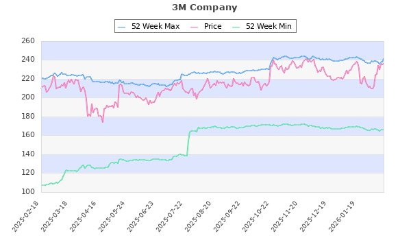 3M Company (NYSE:MMM) Manufacturing 236.90 166.23 241.77 94 4.31 0.00 28.62 2.49 1.82 Sep, Dec, Mar, Jun,