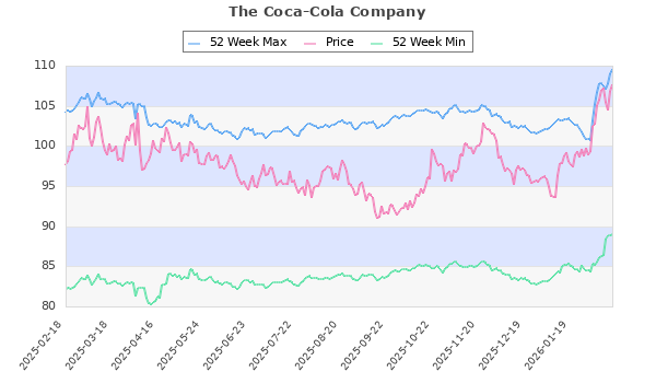 The Coca-Cola Company (NYSE:KO) Food 107.66 89.06 109.58 91 2.79 0.00 25.89 0.79 2.59 Oct, Dec, Apr, Jul,