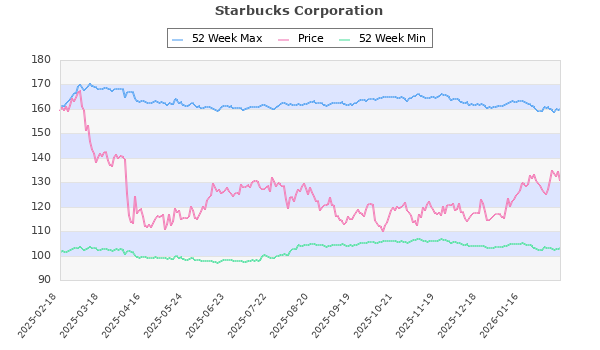 Starbucks Corporation (NASDAQ:SBUX) Food 131.02 102.89 160.07 49 3.46 0.00 78.13 0.76 2.64 Aug, Nov, Feb, May,