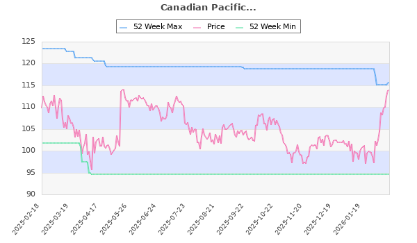 Canadian Pacific... (TO:CP) Transportation 113.84 94.60 115.54 92 0.91 0.00 25.27 1.33 0.80 Oct, Jan, Apr, Jul,