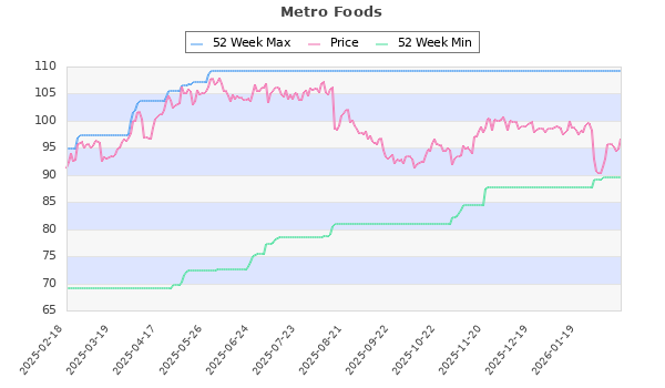 Metro Foods (TO:MRU) Food 96.64 89.64 109.20 36 1.62 0.00 21.53 1.16 1.68 Jun, Sep, Nov, Mar, May,