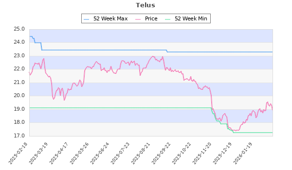Telus (TO:T) Telecom 18.96 17.26 23.29 28 1.73 0.00 23.73 0.20 9.12 Jun, Dec, Mar, Sep, Oct, Jan, Apr, Jul,