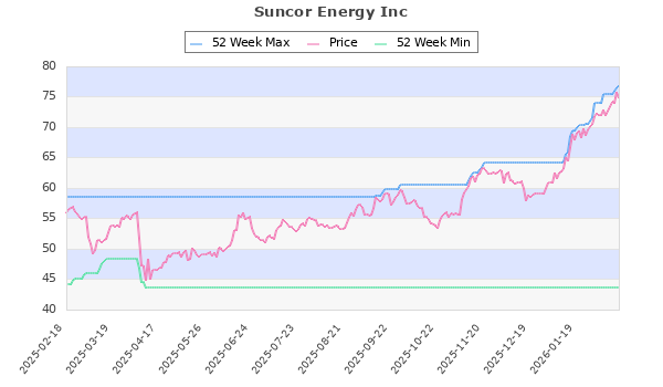 Suncor Energy Inc (TO:SU) Energy 74.90 43.59 76.84 94 2.36 0.00 17.84 1.10 3.15 Sep, Dec, Mar, Jun,