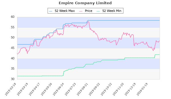 Empire Company Limited (TO:EMP-A) Food 48.57 41.85 58.32 41 0.87 0.00 16.61 0.00 1.80 Jul, Oct, Jan, Apr,